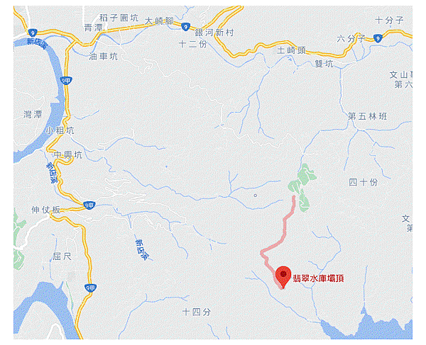 可以在GOOGLE地圖輕鬆找到翡翠水庫壩頂,畫紅色這一小段路起點是靈骨塔。越過墓園後馬上會看到夾道的杉木林道,這段走來感覺極像漫遊在深山森林中的小徑。長約1公里。